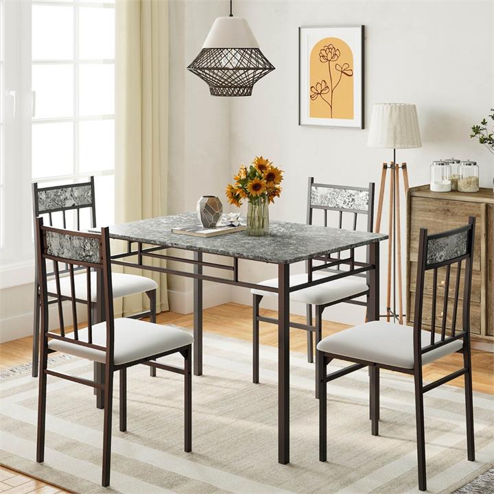Our modern dining table set will be a wonderful addition to your space. Decorated with a unique marble-like texture, this dinette set brings a simple and luxurious style to your room. The tabletop is made of safe material and is also scratch-resistant and wear-resistant for long service life. Designed with a high back and cushion seats, the chairs are comfortable to sit on. Using premium steel pipes with spraying treatment, the frame is not only heavy-duty but also endurable for years of use. The cleaning is easy because of the waterproof tabletop. And the assembly is quick with instructions. Bullet Point: 5 Pieces Modern Dinette Set: This 5-piece dining table set comes with a rectangular table and 4 matching chairs, which allows various activities with your family and friends such as eating, playing and chatting. And its modern style can easily fit into your existing house decorations, adding more charm to your space. Unique Marble-Like Texture: The tabletop is decorated with a delicate marble-like texture, which echos the same texture on the chairs’ backrests. The beautiful tabletop is made of premium material that is not only safe for the human body but also wear-resistant and scratch resistant to ensure long-lasting service. Comfortable Sitting Experience: The included dining chairs features a high back design, which permits you to easily pull out the chairs before you are seated. The high back design also provides ample support to your spine while the upholstered cushion seat makes long time sitting less painful. Reliable & Durable Structure: The frame is made of sturdy steel pipes that adopt a spraying process for water resistance and scratch resistance, offering large weight capacity and capable of long-time use. The chairs are equipped with non-slip foot pads to increase stability and safety during use. Easy to Assemble & Maintain: The assembly is easy and quick with included instructions and accessories. Besides, the waterproof tabletop is convenient to clean with a damp cloth. Table dimension: 107 x 70 x 76 cm (L x W x H). Chair dimension: 40 x 41 x 90 cm ( L x W x H). Seat height: 46cm. Features: 5-piece dining table set includes a table and 4 chairs Eye-catching tabletop decorated with marble-like surface Safe rounded edges prevent scratches and bruises High-back chairs with cushion seat ensure the comfortable sitting experience Made of sturdy steel pipes with spraying treatment Equipped with non-slip foot pads for extra safety and stability Smooth and waterproof surface is quick to clean with a damp cloth Easy to assemble with instructions and accessories Specifications: Colour: As the Picture Shows Material: MDF, PVC, Steel Table Dimension: 107 x 70 x 76 cm (L x W x H) Chair Dimension: 40 x 41 x 90 cm ( L x W x H) Net Weight (Table & Chairs): 28.7kg Weight Capacity of Table: 60kg Weight Capacity of Chair: 80kg Package Includes: 1 x Dining Table 4 x Chairs 1 x User Guide Box Qty:1(May vary by batch)