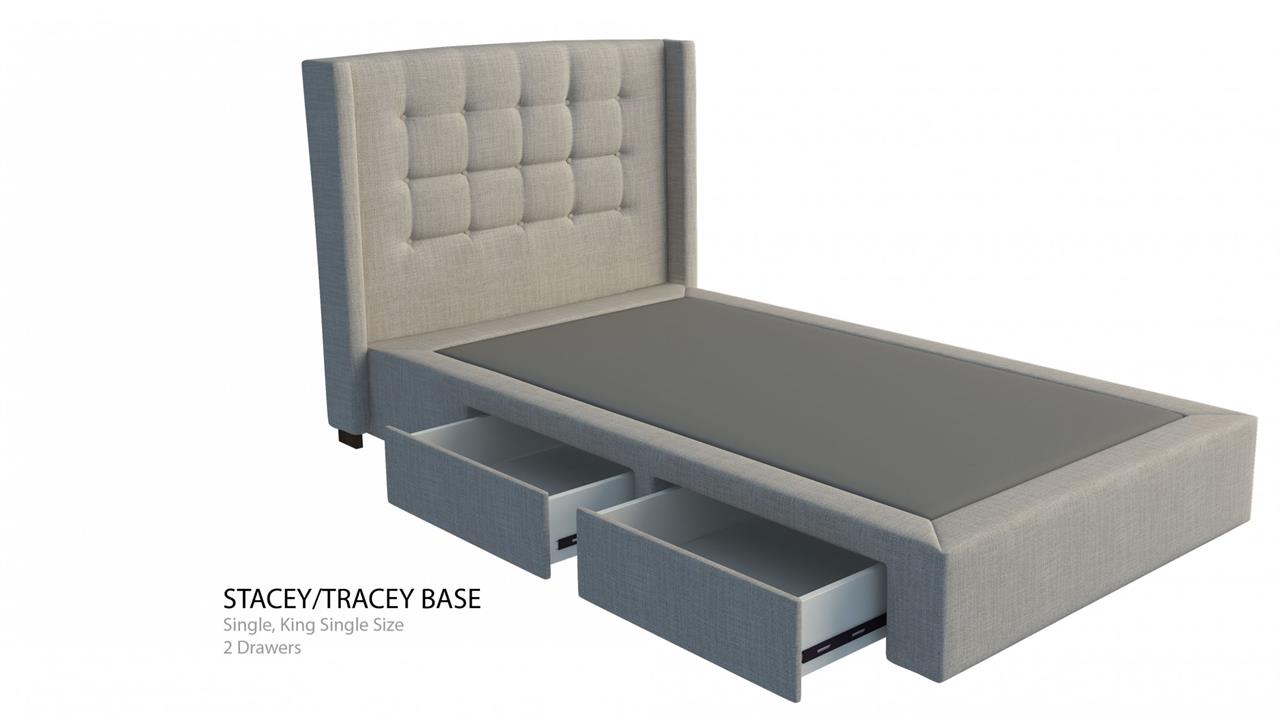 The Stacey Custom Drawer Upholstered Bed Base offers a modern storage space solution. This option is available in Double, Queen, King and Super King base with two deep drawers positioned on both the right and left-hand side of the bed base. If ordered as a Single or King Single size, the base is only available as a one-piece with one drawer, positioned on either the right or left-hand side of the base.