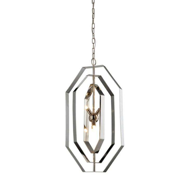 This exotic lighting style meets the elegant home fashion scene making all the rooms exquisitely beautiful. It features a single-light cluster surrounded with three concentric stainless steel pentagon shape. This is surely the perfect sized orb to be used as a single light source or several can be grouped together in a counter or island design. The addition of nostalgia styled candelabra bulbs completes this popular style.
