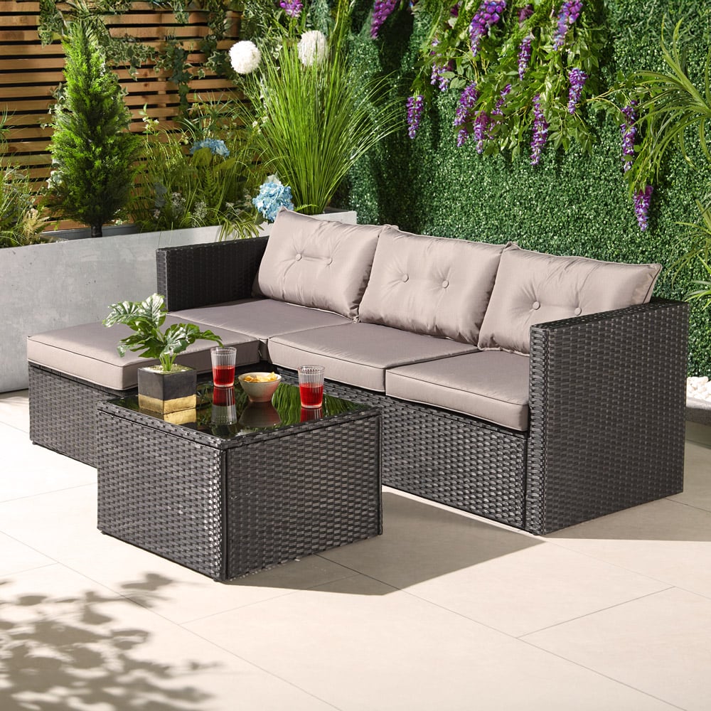 Introducing the Antigua garden corner sofa set, the sure-fire way to get the whole family enjoying the great outdoors all year round. The sleek black frame and contrasting grey cushions make a subtle style statement that’s sure to complement any garden décor, colourful or neutral; contemporary or classic.MAXIMISE YOUR OUTDOOR SPACE WITH CORNER GARDEN FURNITURELooking for ways to make the most of a small garden? Our outdoor corner sofa is the perfect way to maximise every inch of space, creating a sense of spaciousness no matter the space limitations. From 4 seater garden furniture to a solo garden sofa to splay out and unwind on – use the corner garden sofa to create a cosy reading nook, inviting relaxation hub, or casual dining spot for summer evenings.FAUX RATTAN SOFA SET: BOTH STYLISH & WEATHER-RESISTANTWhy faux rattan? Unlike natural wicker, PE (polyethylene) rattan is low maintenance, highly durable, and super weather resistant. Come showers or shine, its UV and water resistant construction built to withstand the seasons – without any sign of fading. And don’t worry – our rattan corner sofa set still boasts all the aesthetic charm of natural rattan, thanks to its intricate weave detailing.NON-SLIP RUBBER FEET FOR STEADY FOOTINGThe rubber feet provide a stable base for your garden sofa set, preventing it from shifting and sliding on your garden, patio, or wooden decking. So no matter how hectic your garden gets, rest assured that your relaxation session will resume undisturbed!What’s more, the protective feet provide a barrier between the outdoor sofa set and the ground, preventing scratches and scuffs to both your garden and the outdoor sofa itself. Robust, comfortable, and timeless; al fresco lounging just got an upgrade.EASY-CLEAN DESIGN TO KEEP MAINTENANCE TO A MINIMUMKeep your garden corner sofa in top condition and keep your garden looking fresh thanks to the easy-to-clean construction. Not only is the 5mm thick tempered glass tabletop built to last and withstand hot drinks, but it’s also super easy to wipe clean.The simple maintenance doesn’t end there – the durable polyester cushions feature secure zip fastenings, allowing you to easily remove the padding. Pop the covers in the wash with a mild detergent and say hello to a refreshed rattan furniture set! Maintain a sleek aesthetic with ease.SKU 2500878 – Antigua 4 Seater Garden Corner Sofa & Table