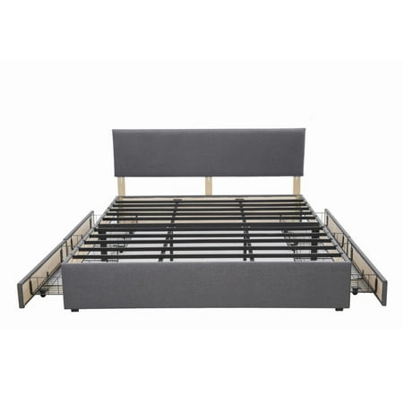72 x 80 Fabric Grey Bed Frame with Headboard Platform Bedframe with 4 Drawers Description Size:80 L x 72 W x 40 H Adjustable Upholstered Headboard Tailor the headboard height to suit your mattress and style preferences. Wrapped in soft linen fabric it offers a blend of comfort and elegance that complements any bedroom décor. Spacious Under-Bed Storage Equipped with 4 built-in drawers this bed frame provides ample space to store bedding clothes or accessories helping to keep your bedroom neat and organized. Sturdy Metal Slats Support Designed with a durable metal slat system the bed frame ensures excellent weight distribution and mattress support eliminating the need for a box spring. Noise-Free Design Crafted with noise-reducing materials and a reinforced frame this bed promises a peaceful night s sleep free from creaks or squeaks. Modern and Practical Construction The platform bed combines contemporary aesthetics with practical functionality making assembly simple and hassle-free while enhancing your bedroom s style