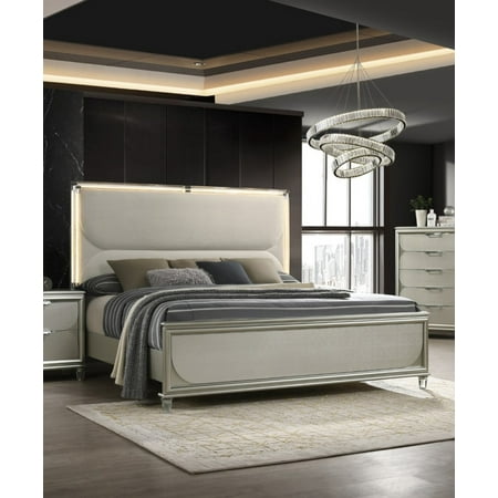Product Description Description:-Glam hardly goes out of style. This look borrows from the opulence of the glamorous look acrylic tubes on HB w LED which make bed looks and attractive centerpiece.Upholstered embossed panel features gives a concept to your room.Product Dimension:Queen Size Bed: 64 W X 86 D X 62 H Product Features : Contemporary Silver Fabric Solid Rubberwood Engineered Wood LED on Headboard Mirror Beveled Mirror Embossed Panels Foundation required Listing Include: 1pc Queen Size Bed Only. MATTRESS: NOT INCLUDED. Dresser Mirror Nightstand And Chest : NOT INCLUDED. Simple Assembly Required.