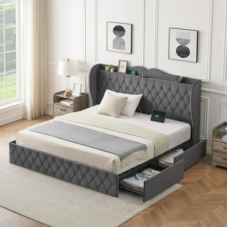 BouPower Upholstered Bed Frame with 4 Drawers and Headboard Platform Storage Bedframe Wooden Slats Support No Box Spring Needed Bed Frame with Charging Station Queen/King Size