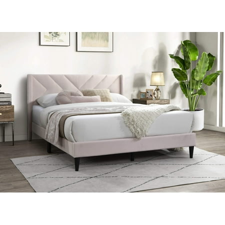 Name: Elegant Modern Light Pink Velvet Upholstered Queen Size Bed Clean Lines Design Headboard 1pc Bedframe Description: Product Description Product Description:-This bed combines style and functionality to create the perfect centerpiece for any Modern space. With its thoughtful construction and attention to detail this Queen bed offers both comfort and style. It s an ideal choice for those looking to enhance their bedroom with a modern and practical piece of furniture. Designed with support legs and a robust platform base this bed provides excellent stability without the need for a box spring. The footboard ensures a streamlined look completing the bed s clean design. The headboard features a distinctive geometric stitched design offering a modern flair that complements any decor. This unique design element adds visual interest and a touch of artistry to your bedroom. Available in neutral colors the velvet upholstery brings a touch of softness and sophistication to your bedroom. The plush material adds a cozy feel making it an inviting spot to relax and unwind.The bed is adorned with plush velvet upholstery offering a soft and luxurious feel that adds a touch of sophistication to any bedroom decor.Designed for convenience this queen bed eliminates the need for a box spring providing a sleek and streamlined look while offering excellent support and comfort.The headboard boasts a modern and geometric design. This unique stitching pattern adds a contemporary flair making the bed a stylish centerpiece.The bed frame stands 12 inches off the floor creating an ideal height for getting in and out of bed comfortably. This elevation also allows for easy cleaning underneath.Product Dimensions:-Queen Size Bed :- Hb 41 H / Fb 12 H Listing Includes :- 1pc Queen Size Bed Only.Dresser Mirror Nightstands And Chest – Not Included.Simple Assembly Requires:Product Features:-Transitional StyleLight pink colorVelvet FabricPlatform BedMaster Bedroom Furniture Characteristics: Modern Style Light Pink Color Velvet Fabric Upholstered Headboard Lines Design Headboard BOX Spring Not REQUIRED Wooden slats Listing Includes – 1pc Queen Size Bed Only. Category: Beds Frames & Bases Is This Item Customized: No Place of Origin: Viet Nam Lithium Battery Contained: No Assembled Length: 80.00(in) Assembled Width: 60.00(in) Assembled Height: 41.00(in) Assembled Weight: 75.00(lb) Package Weight: 100(lb) Package Length: 66(in) Package Width: 23(in) Package Height: 9(in) Box Spring Requirements: Box Spring Not Required Bed Size: Queen Main Color: Light Pink Bed Frame Material: Wood Use Case: Bedroom Product Style: Contemporary Modern Bed Type: Bed Frame Upholstery Material: Velvet Main Material: Velvet