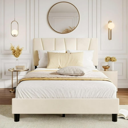 Full Size Bed Frame with Adjustable Headboard Velvet Upholstered Tufted Twin Platform Bedframe with Strong Wooden Slats Mattress Foundation No Box Spring Needed Easy Assembly Beige