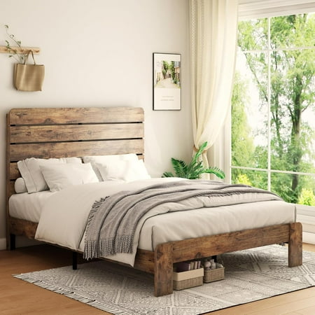 Full Size Bed Frame with Headboard Wooden Wood Bed Frame Full Size Rustic Farmhouse Style Sturdy Full Bedframe with 12 Wooden Slat Support Noiseless Easy to Assemble