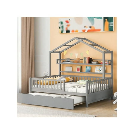 ✔[Ample Storage with Bookshelf]This full-size house bed frame is shaped like a house with a pitched roof and storage shelf. The upper side of the bed features a row of bookshelves creating a wonderful space for storing books and more. ✔[Safe & Secure Design]This full-size house bed is designed with the use of a semi enclosed space added bed rails all around to ensure the safety while they sleep. It provides peace of mind for parents and a cozy and secure sleeping environment. The bed is easy to assemble with detailed instructions and numbered parts provided in two packages. ✔[Sturdy & Durable Wood Frame]The main structure of this house bed including the original wood-colored batten frame and bed. Comes with slat you don t need to prepare springs or foundations. The slats and other components are constructed from high-quality MDF ensuring sturdiness and durability. ✔[Charming House-Shaped Bed]This bed is designed to resemble a house create a magical and functional space. There is also a trailer bed that can be used for playmates. The natural wood-colored frame with original wooden slatted details brings a touch of nature indoors and adds character to the space. ✔[Appropriate Size]Product Overall Size: 77.6 L x 57.8 W x 70.9 H. Mattress not included. Although we provide clear instructions and tools some assembly is still required.