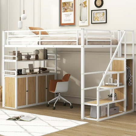Full Size Loft Bed Frame with Storage Staircase and Wardrobe Metal Loft Bed with Shelves and Lockers Space Saving Design Bedframe with Safety Guardrail & Ladder White
