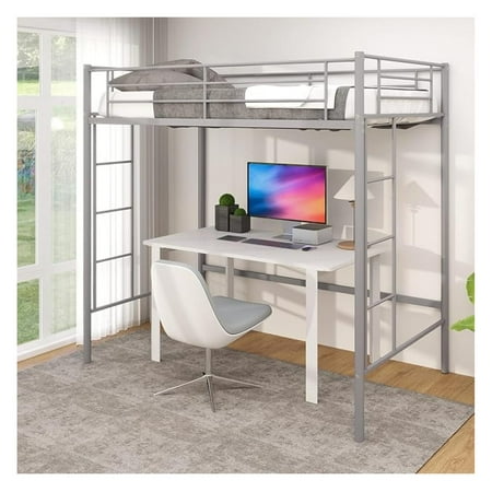 A practical silver twin loft bed featuring dual ladders and safety guardrails for easy access and security. This heavy-duty metal frame creates valuable space underneath for a desk storage or seating-ideal for juniors teens and adults. The noise-free space-saving design requires no box spring making it a smart choice for compact living areas.