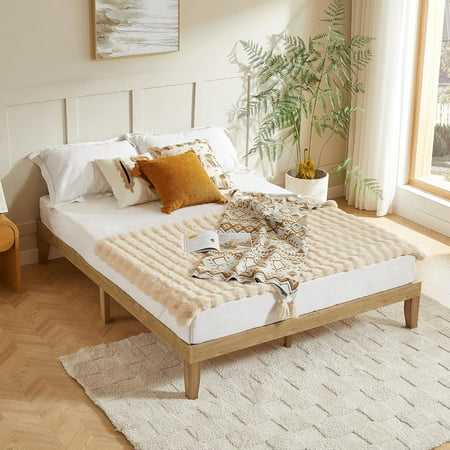 [Minimalistic Stylish Design]This bed frame features a modern simple design. The classic wood tones and natural grain offer timeless appeal adding a touch of elegance and sophistication to your bedroom. Whether you re going for a mid-century modern vibe or a classic farmhouse aesthetic this wooden bed frame complements any interior style while creating a warm or cool ambiance. [Strong Stability]Equipped with supportive solid wood legs and slats that are firmly secured with screws this bed frame ensures excellent stability and prevents shifting or noise. Even when you turn over during the night the frame remains quiet and sturdy. It supports up to 800 pounds offering reliable durability. [No Box Spring Required]The closely spaced solid wood slats are designed for long-lasting strength resisting bending and warping over time. Suitable for latex memory foam or spring mattresses this bed frame eliminates the need for a box spring-streamlining your bedroom setup and extending mattress life. [Under-Bed Storage Space]With 8.5 inches of clearance under the bed this frame offers ample storage space for small or occasional-use items. It helps you maximize space and maintain a neat organized bedroom. The height also makes it easy to clean underneath supporting a tidy environment. [Easy to Assemble]Assembly is simple and efficient thanks to the included detailed instruction manual clearly labeled parts and all necessary tools. Two people can assemble the bed frame in about an hour. For any assistance please feel free to contact us directly.