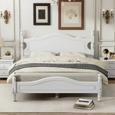 Queen Bed Frame – Retro Style Wood Platform Bedframe with Sturdy Wooden Slat Support-White