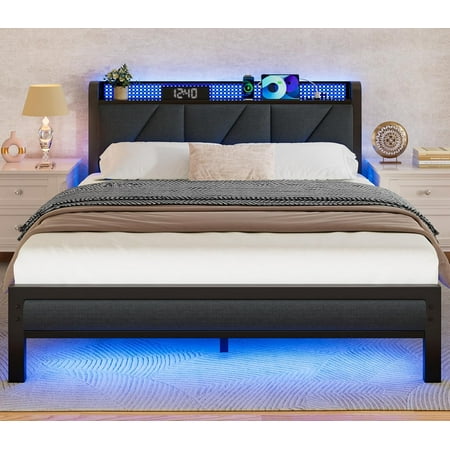 Product description Upholstered Queen Size Bed Bed Frame with Charging Station Bed Frame with LED Light The video showcases the product in use. The video guides you through product setup. The video compares multiple products. The video shows the product being unpacked. hero-video Merchant Video RGB LED Lights 29 Colors Change with the Rhythm of the Music Remote/APP Control Product Details Previous page Charging Station Charging station with power outlet and USB port you can install it left or right according to your need Noise-Fress Silence foam help to avoid squeaky noise Easy Install Fast installation with bolt free Under Bed Storage Extra Storage underbed Next page