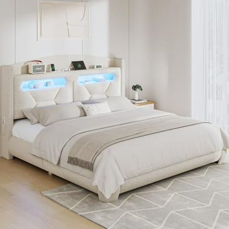 Aesthetically pleasing and functional design: The curved winged design adds sophistication and ensures comfort and safety. When you lie down on the LED bed frame it hugs your and back allowing you to relax. The curved corners are covered with soft terry fabric to prevent injuries when you move around. Self-attaching RGB light strip: You can attach the RGB light strip to the headboard of this LED bed and adjust the 60 000 colors and modes via the mobile app or remote control. It can be a dim nightlight so you don t have to fumble around in the dark or a twinkling light to add ambience to your party. Storage Shelf with Outlet: The queen size bed frame with headboard features a storage shelf with one USB and one Type-C port. The outlets within easy reach allow you to comfortably recline and charge. You can also keep your cell phone on the shelf or in a side pocket so it s fully charged when you wake up. Stable & Noise-Free Bed Frame: Our queen size bed frame with headboard comes with sturdy wood slats and steel tubing that can hold up to 1 200 pounds so you can lie down without a care in the world. Built-in quiet bars prevent creaks and chafing noises so you can sleep soundly through the night. Hassle-Free Assembly: All parts of the white bed frame are delivered in one package with clear and easy to understand labels making it easy for you to complete the assembly. If you have any questions please feel free to contact us our professional team will provide you with a satisfactory solution within 24 hours.