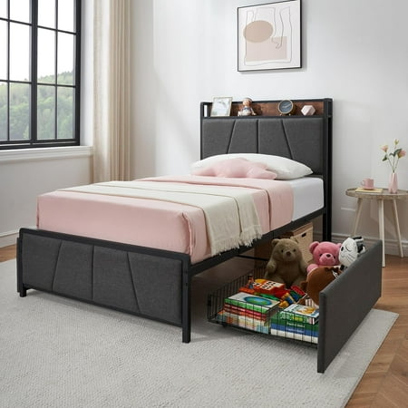 Twin Size Bed Frame with 2 Storage Drawers and Charging Station Upholstered Platform Bedframe with Storage Headboard Heavy Duty No Box Spring Needed Easy Assembly Noise Free