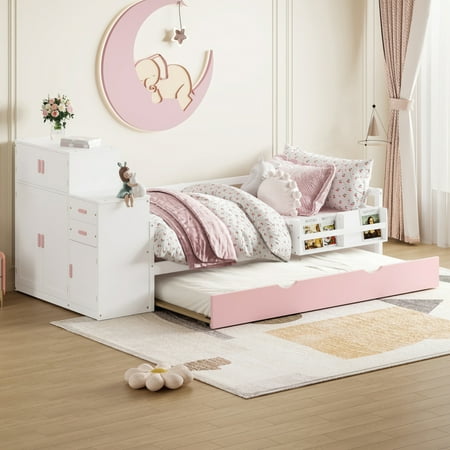 Home Twin Size Bed Frame with Trundle Wood Platform Bed with Wardrobe Storage Cabinet Multifunctional Bedframe with Side Small Bookshelf for Girls Boys Teens Pink+White