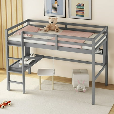 Description Discover the twin size loft bed with desk and shelves a clever and space-saving solution for any bedroom. This wooden loft bed frame combines functionality with style offering a twin-sized sleeping area raised off the ground along with a built-in desk and shelves for additional storage and workspace.The safety guardrail ensures a secure sleeping environment preventing accidental rollouts and providing peace of mind for both parents and children. The included ladder makes it easy to climb up to the bed with a sturdy design that can support the weight of an adult.Crafted from high-quality wood the loft bed frame is both durable and stylish. Its timeless aesthetic complements both traditional and modern decor styles making it an ideal choice for any bedroom. The desk and shelves provide ample storage and workspace making it perfect for students home offices or any room where space is limited.The twin size loft bed with desk and shelves is designed to maximize floor space creating a cozy sleeping area while still leaving plenty of room for other activities or furniture. Its space-saving design makes it an essential choice for small bedrooms apartments or any room that needs to serve multiple purposes.Overall this versatile and practical loft bed frame is a must-have addition to any bedroom. With its built-in desk and shelves safety guardrail and sturdy ladder it offers a safe secure and space-saving sleeping solution that s perfect for any home. Don t miss out on this stylish and functional loft bed for your bedroom! Product Information Optional Color:White Grey Main Material:Pine Bed Size:Twin Assembled Length (in.):79.50 Assembled Width (in.):43.60 Assembled Height (in.):65.00 Weight (lbs.):105.80