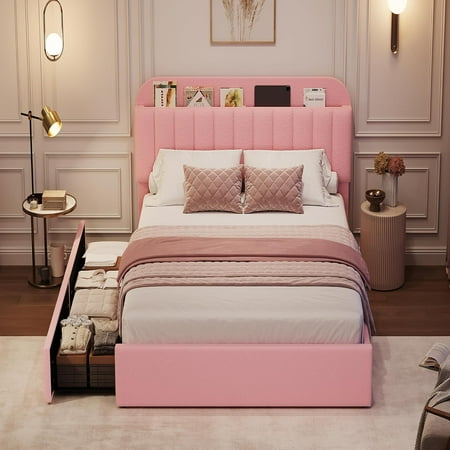 Twin XL Size Bed Frame with 2 Storage Drawers Bedframe with Storage Headboard Upholstered Bed Frame No Box Spring Needed Easy Assembly Pink