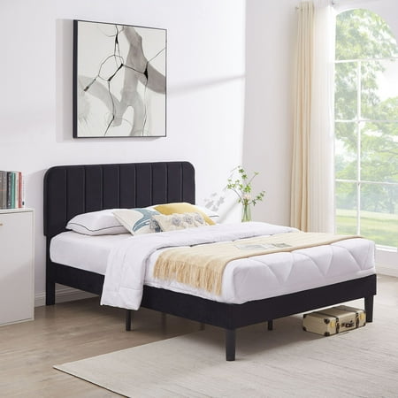 VECELO Queen Size Bed Frame with Upholstered Headboard Velvet Platform Bedframe Mattress Foundation Strong Wood Slat Support No Box Spring Needed Velvet Black