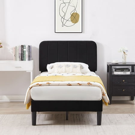 VECELO Twin Size Bed Frame with Upholstered Headboard Velvet Platform Bedframe Mattress Foundation Strong Wood Slat Support No Box Spring Needed Velvet Black