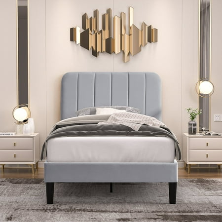 Home VECELO Twin Size Bed Frame with Upholstered Headboard Velvet Platform Bedframe Mattress Foundation Strong Wood Slat Support No Box Spring Needed Velvet Light Grey