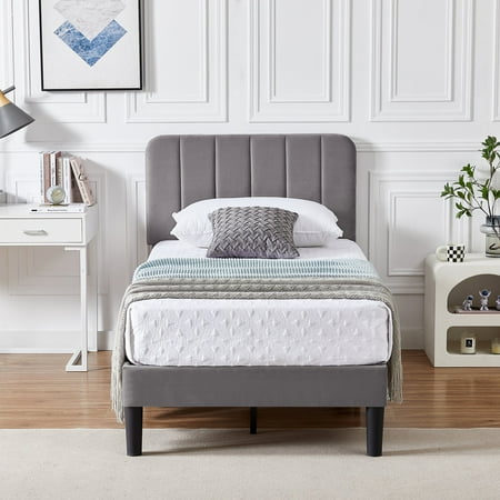 Home VECELO Twinn Size Bed Frame with Upholstered Headboard Velvet Platform Bedframe Mattress Foundation Strong Wood Slat Support No Box Spring Needed Velvet Dark Grey