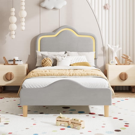 Velvet LED Bed Frame with Adjustable Headboard and Footboard Upholstered Princess Platform Bedframe Solid Wood Slats Noise Free & No Box Spring Needed Easy Assembly