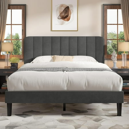 Wangxin Full Size Bed Frame with Upholstered Headboard Velvet Platform Bedframe Mattress Foundation Strong Wood Slat Support No Box Spring Needed Grey